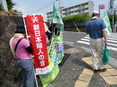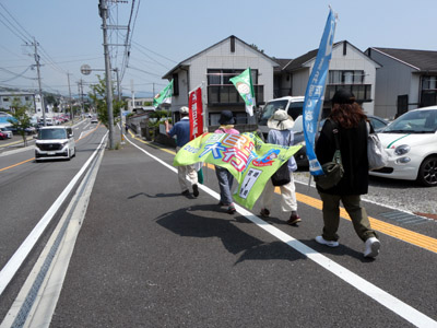 市役所前で出発に際しての説明を受ける 医療生活協同組合の幟を持っているのが筆者の私 |