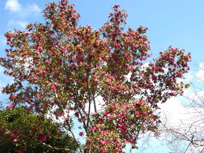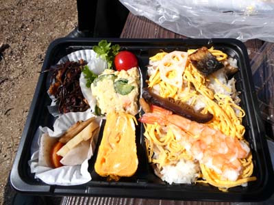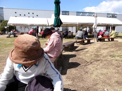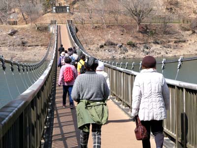 | 渡り終えると盛りを過ぎた椿が迎えてくれた お楽しみの昼食風景 |