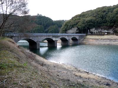 | 吊り橋渡り終えて湖水と対岸を見る |